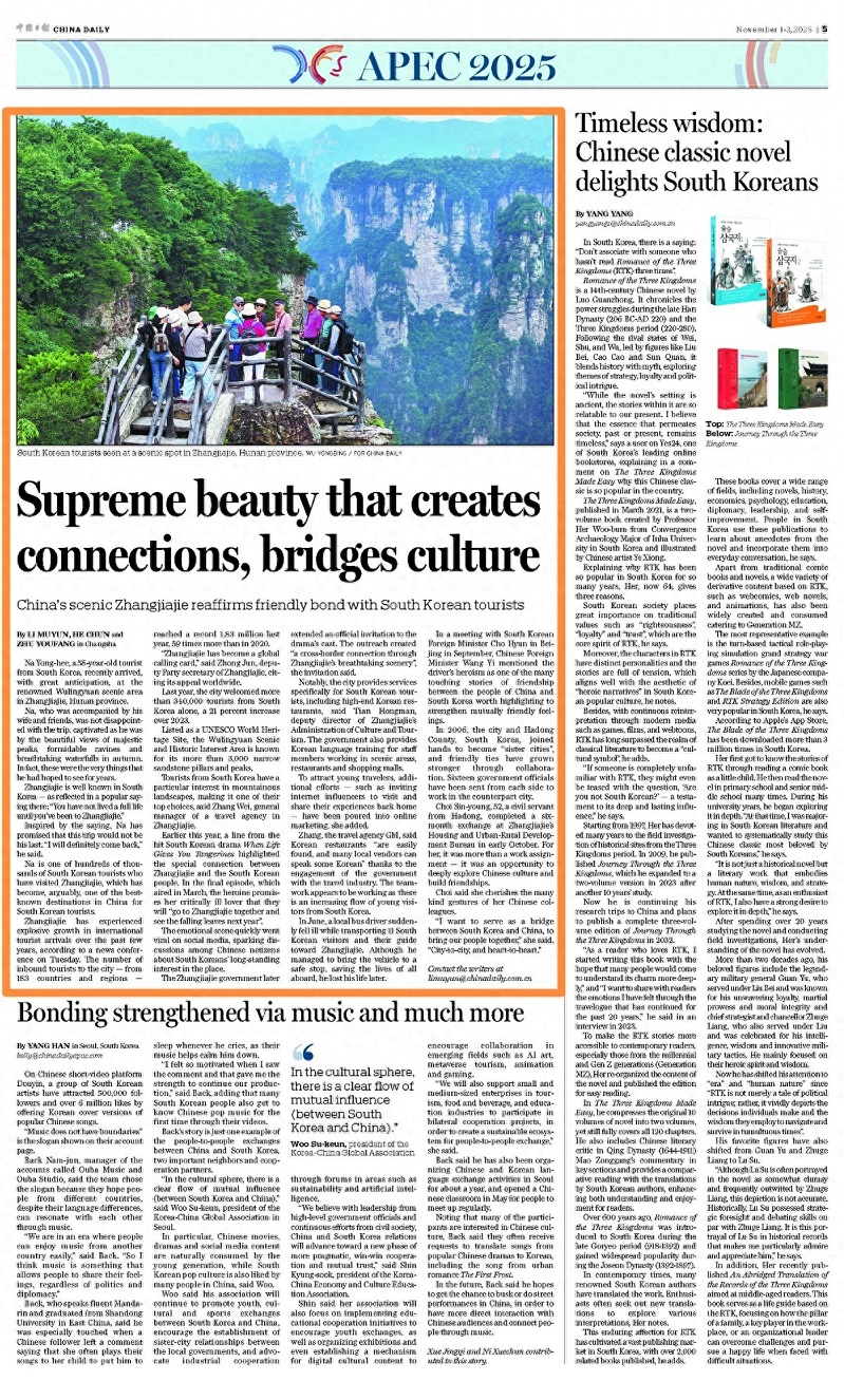 2025年11月1日,在中國領(lǐng)導(dǎo)人出席APEC會議并對韓國進(jìn)行國事訪問之際,《中國日報(bào)》高訪??诘谖灏骖^條刊發(fā)報(bào)道“Supreme beauty that creates connections, bridges culture”,講述張家界與韓國從民間到官方的友好交流交往故事。